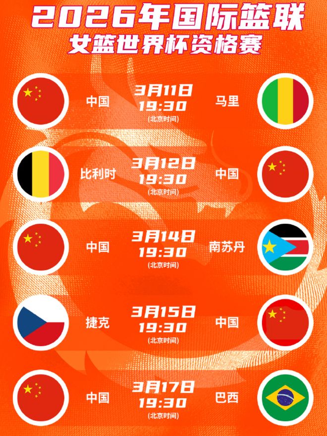 中国女篮世预赛赛程出炉:七天5赛,PK五大对手